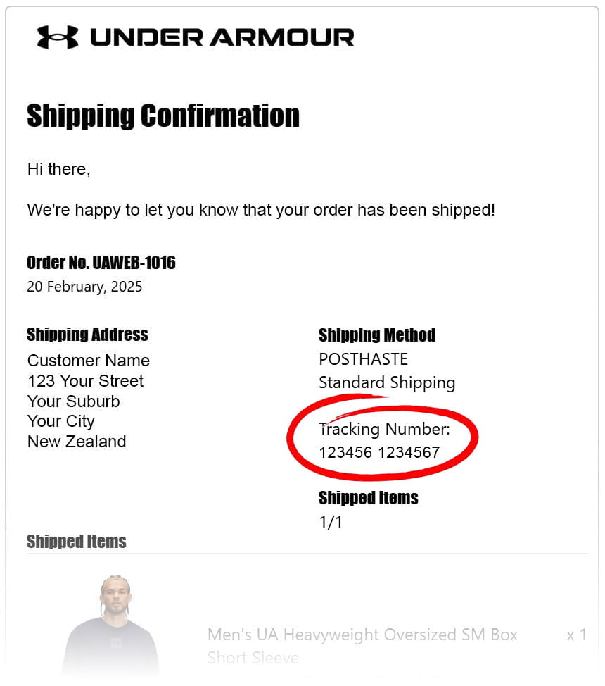 Open that email and scroll down to the “Shipping Method” section—your tracking number will look something like 123456 1234567.